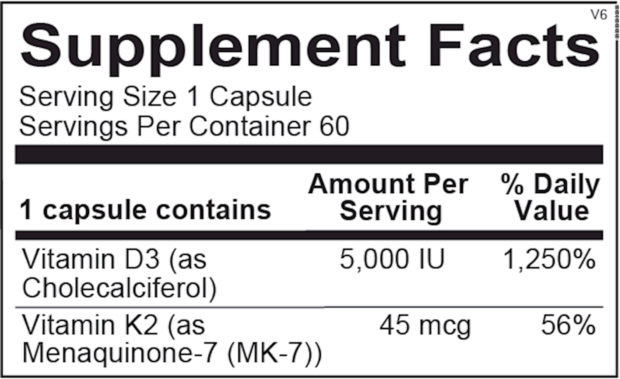 Vitamin K2 with D3 includes 45 mcg of MenaQ7® PRO, the most widely studied form of vitamin K2 as MK-7, and 5,000 IU of vitamin D3 per capsule for optimal absorption and use by the body.